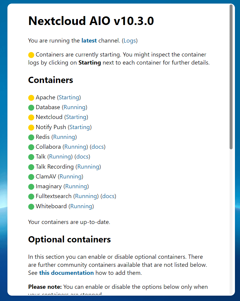 Je nach Internetgeschwindigkeit und Leistungsfähigkeit der Hardware kann das einige Minuten dauern. Mit einem Klick auf „Starting“ kann man das Log des jeweiligen Containers einsehen. Während die Installation läuft, können wir uns um das Reverse Proxy Setup kümmern.